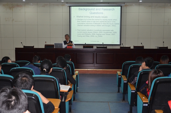 5月23日,我院邀请美国佛罗里达国际大学终身教授、奈特-雷德研究员蒋晓泉先生来我校讲学。蒋晓泉首先为财经学院师生做了题为《Equity Issues and Market Timing》的学术报告,并就应用经济学重点学科建设、金融工程专业建设、以及教学、科研、国际访学等方面的合作与财经学院师生进行深入交流。我院全体教师、应用经济学重点学科方向带头人、各专业负责人、金融工程专业学生参加了各项活动。