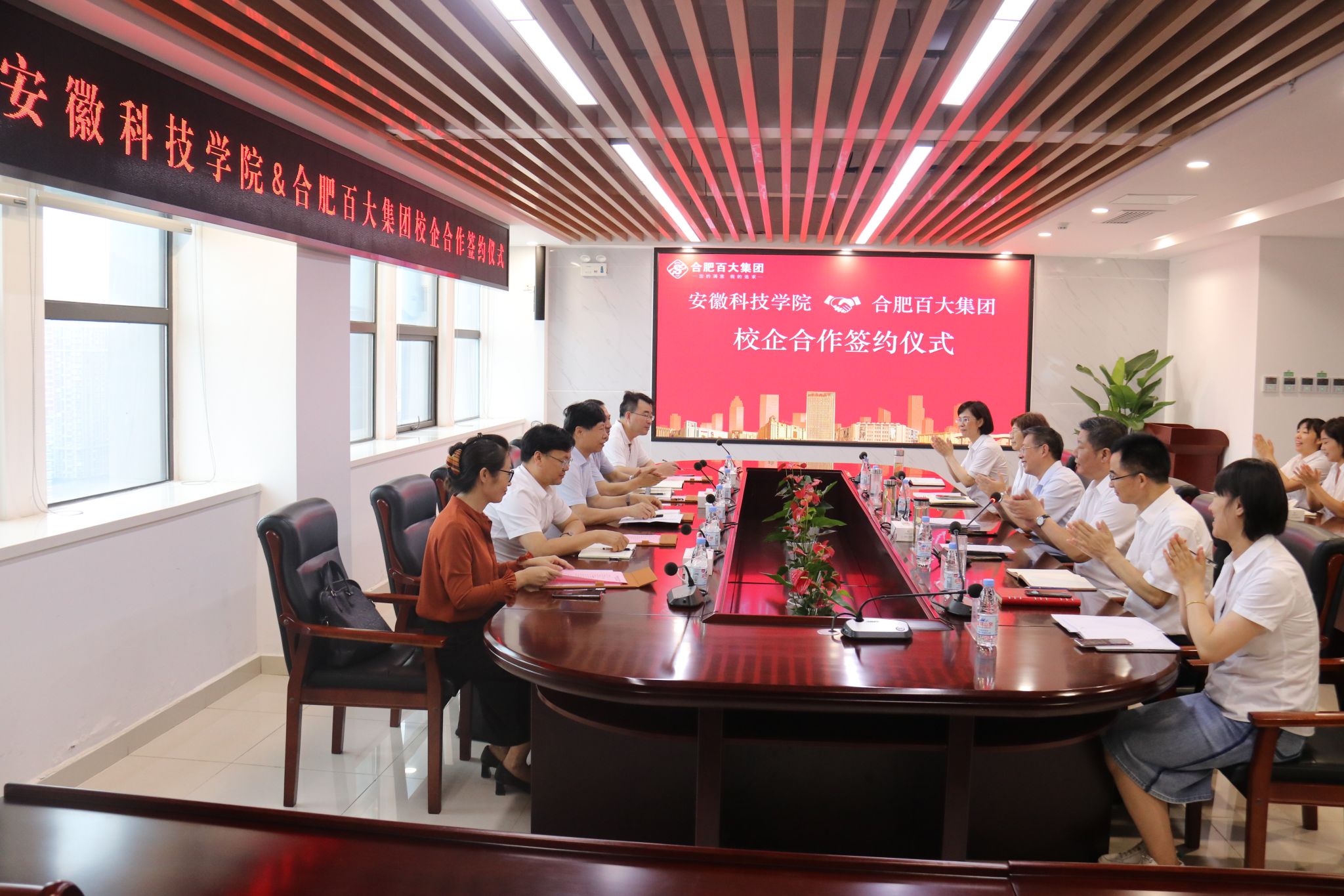财经学院院长郝世绵和百大集团党委委员、工会主席裴文娟代表双方签署了《合肥百大集团 QY球友会战略合作协议》;双方观看了合肥百大集团宣传片,并围绕智力共用、人才共育、项目共研、平台共享等进行深入交流。
