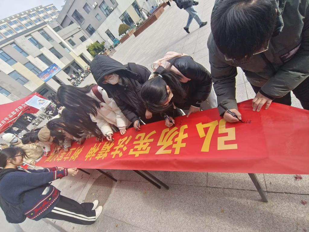 广场拉横幅,师生共签名。12月4日,财经学院易班工作站在龙湖校区小广场摆起摊子,拉起横幅,师生携手绘就“弘扬宪法精神、树立宪法权威”的恢弘画卷,形成浓厚的师生共建法治校园氛围。