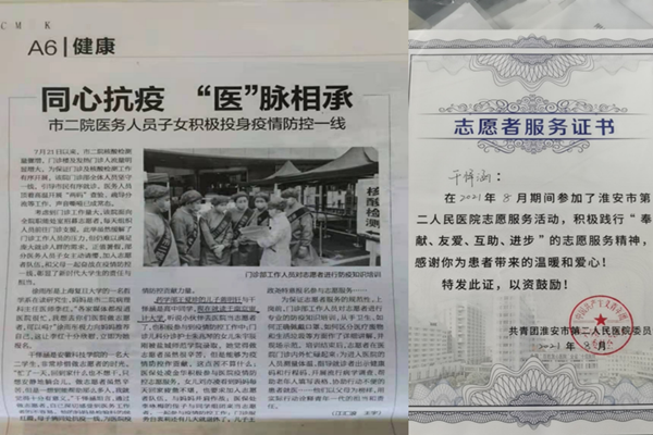 因在抗疫一线志愿服务期间的优异表现,淮安电视台和淮海晚报对干怿涵等志愿者进行了采访。干怿涵说道:“每天回家后动也不想动,只想安静地躺会儿,但是想到能为社会做点事情,能够帮助到那么多人,我感觉很有意义”。在他看来,作为QY球友会的一名入党积极分子,在国家和社会需要的时候,应该不畏困难,毅然决然的挺身而出。