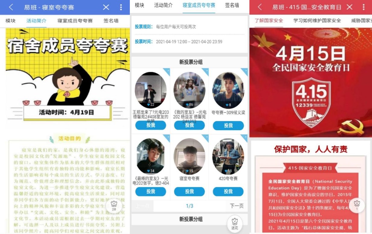 4月,学院深入拓展易班工作站教育教学服务功能。学院易班微社区发布推文10篇,转载学院新闻9篇,旨在对学生进行思想引领,便于学生了解学院实时动态。学院易班工作站创新方式方法,创建“寝室夸夸赛”与“415 国家安全教育日”两款轻应用,为学生搭建沟通桥梁,开展安全教育工作,获得全院师生一致好评。此外,学院易班工作站优化队伍结构,新增王玺权、李乐添两名新成员配合易班日常工作开展。根据各班级一月份活跃度数据,评选出电信202班为“电气与电子工程学院优秀易班班级”,鼓励各班提高易班使用率。(特约通讯员:王延丽 审核:尚磊)