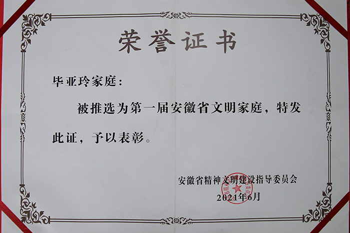 我校教师毕亚玲家庭荣获安徽省首届“文明家庭”荣誉称号