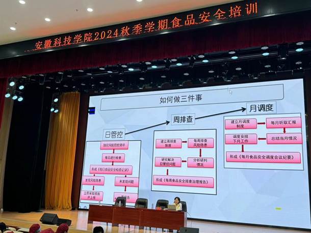 为进一步加强学生食堂食品安全管理,提高食堂从业人员的法律意识、责任意识和风险意识,2024年8月30日,由后勤保障部牵头,邀请蚌埠市市场监督管理局餐饮科科长乔红艳及龙子湖区市场监督管理局副局长郭晓琳在我校龙湖校区组织开展了学生食堂食品安全培训。培训会由后勤保障部副主任谷凯主持,饮食服务监管中心、各食堂管理人员及食堂从业人员参加了培训。