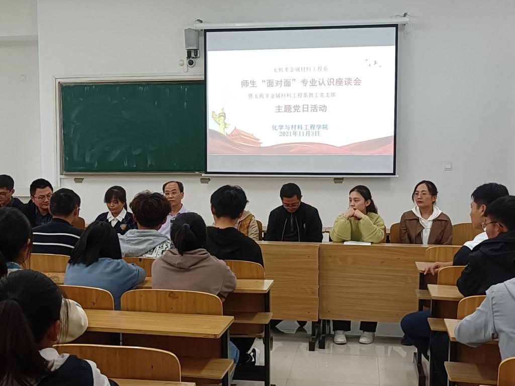 在无机非金属材料工程系教工系党支部书记陈君华教授的组织下,无机非金属材料工程系教工党员与2021级无机非金属材料工程专业学生在致知楼C204召开了“师生面对面专业认知座谈会”,陈教授生动形象的讲述,点燃了同学们的专业热情,随着同学们踊跃的提问,老师们的积极回答,同学们心中的疑惑解开了,老师们紧缩的眉头舒展了,师生们脸上的笑容愈发灿烂,教室里时常传来阵阵掌声。