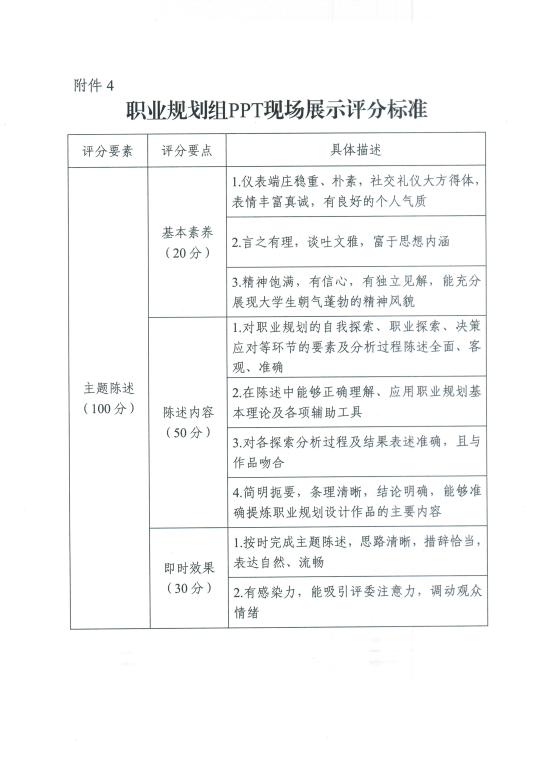 职业规划组比赛分为书面作品评审、PPT 现场展 示与问答二个环节。