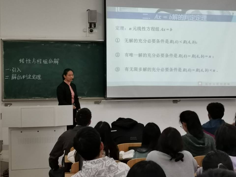 信息与网络工程学院副教授郭竹梅老师为青年教师做了《线性代数》示范观摩课。郭竹梅老师通过简洁的课程引入、精准的课程节奏、整齐的板书、精美的课件,思政元素融入自然,讲解环环相扣,课堂精彩纷呈,受到师生的一致好评,达到预期效果。