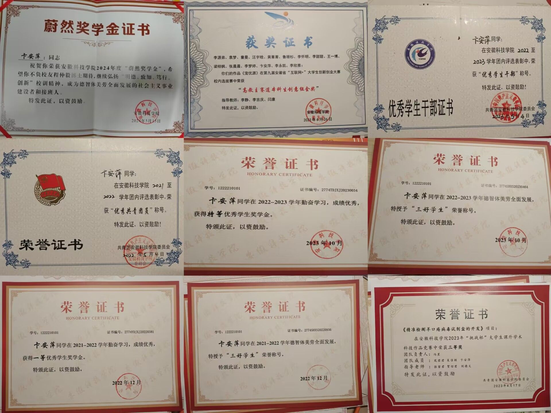 卞安萍,女,汉族,中共预备党员,动物医学专业2021级学生。曾获学业特等奖学金、学业一等奖学金,多次获评校“三好学生”“优秀学生干部”“优秀共青团员”等荣誉称号;拥有实用新型专利一项,发表学术论文两篇,获校级互联网+大学生创新创业大赛金奖等多项荣誉。