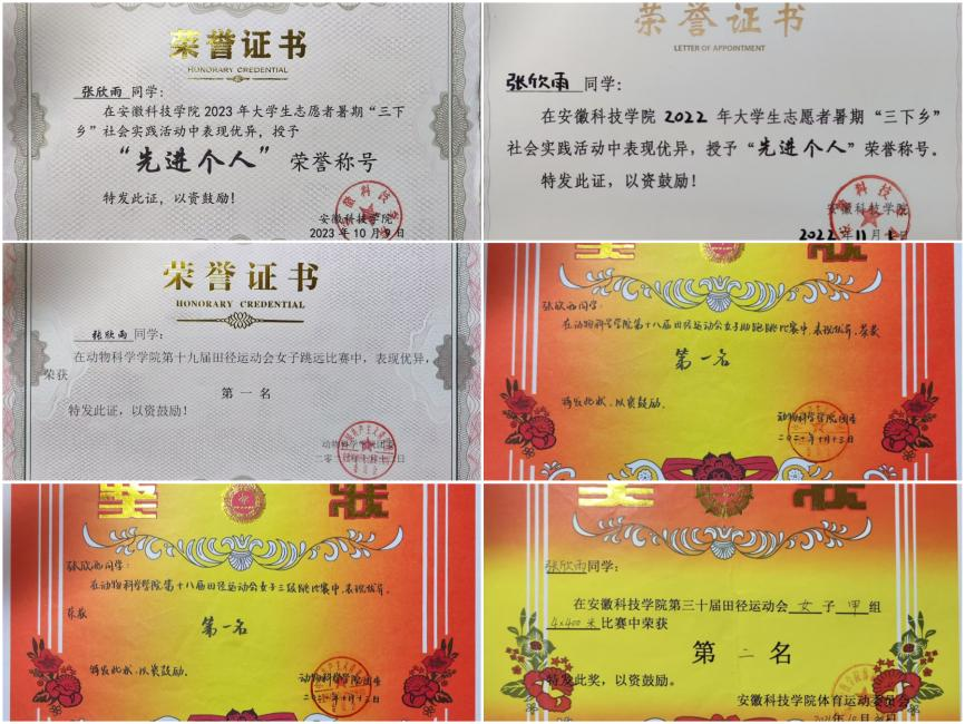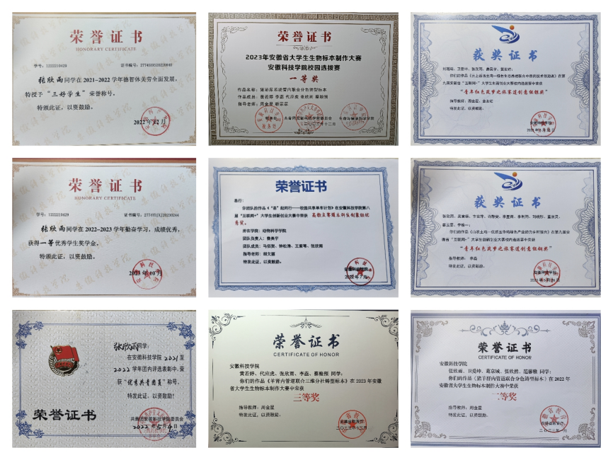在科技创新方面,张欣雨自大一就积极参加各类学科竞赛,积累了许多课本中学不到的宝贵技能,目前已获得QY球友会“互联网+”大学生创新创业大赛银奖、铜奖、优秀奖,QY球友会全国大学生电子商务“创新、创意及创业”挑战赛三等奖,安徽省大学生生物标本制作大赛二等奖、三等奖。