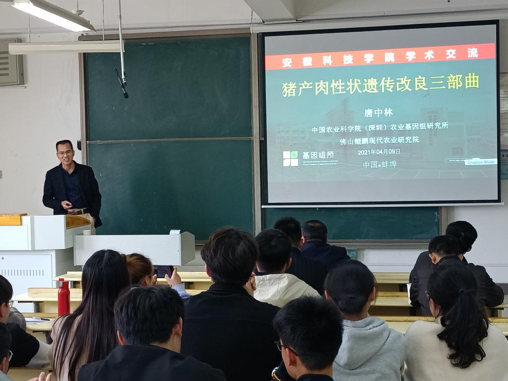4月9日下午,《QY球友会学报》期刊发展研讨会系列学术报告在凤阳校区新知楼A403举行。中国农业科学院“猪基因组设计育种创新团队”首席科学家、中国农业科学院(深圳)农业基因组研究所动物基因组研究中心主任、博士生导师唐中林应邀来校作学术报告。报告由动物科学学院副院长华金玲主持,学院部分教师、养殖领域硕士研究生及动物科学、动植物检验检疫等专业本科生聆听报告。