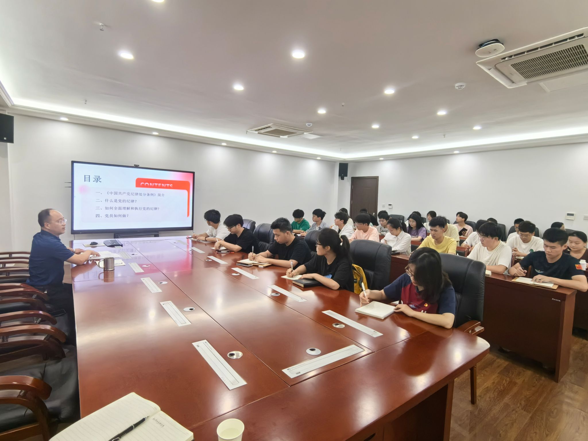 6月21日上午,电气与电子工程学院在西辅楼317会议室开展学生党员党纪学习教育专题党课。党课由学院党委副书记、纪委书记尚磊主讲,学院学生党员参加党课。