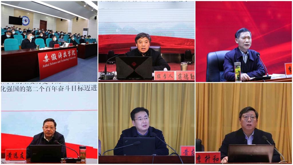 【综述】12月1日,我校在凤阳校区会议中心第一报告厅视频分会场,组织参加省委教育工委举办的学习贯彻党的十九届六中全会精神省委宣讲团宣讲报告会。省委宣讲团成员、安徽中医药大学党委书记王先俊教授作学习贯彻党的十九届六中全会精神宣讲,省委教育工委副书记、教育厅厅长赵振华在主会场主持报告会;12月7日,我校在凤阳校区新图书馆十楼会议室召开专题学习会,集中学习习近平总书记在全国宗教工作会议上的重要讲话精神。会议由校党委委员、副校长黄友锐主持;12月8日,校党委书记蒋德勤在凤阳校区大学生活动中心为动物科学学院、外国语学院、人文学院、马克思主义学院和机关党委、离退休党总支教职工和研究生、本科生代表作党的十九届六中全会精神宣讲报告;12月8日,校党委副书记、校长李震在龙湖校区图书馆东报告厅为建筑学院、财经学院和化学与材料工程学院教职工和研究生、本科生代表作党的十九届六中全会精神宣讲报告;12月9日,校党委委员、副校长黄友锐在凤阳校区会议中心第二报告厅为生命与健康科学学院、食品工程学院、体育教学部教职工和研究生、本科生代表作党的十九届六中全会精神宣讲报告;12月15日,校党委委员、副校长黄远友在龙湖校区图书馆东报告厅为信息与网络工程学院、电气与电子工程学院、管理学院教职工和研究生、本科生代表作党的十九届六中全会精神宣讲报告;12月15日,校党委委员、副校长李升和在凤阳校区会议中心第二报告厅为农学院、资源与环境学院、机械工程学院教职工和研究生、本科生代表作党的十九届六中全会精神宣讲报告。