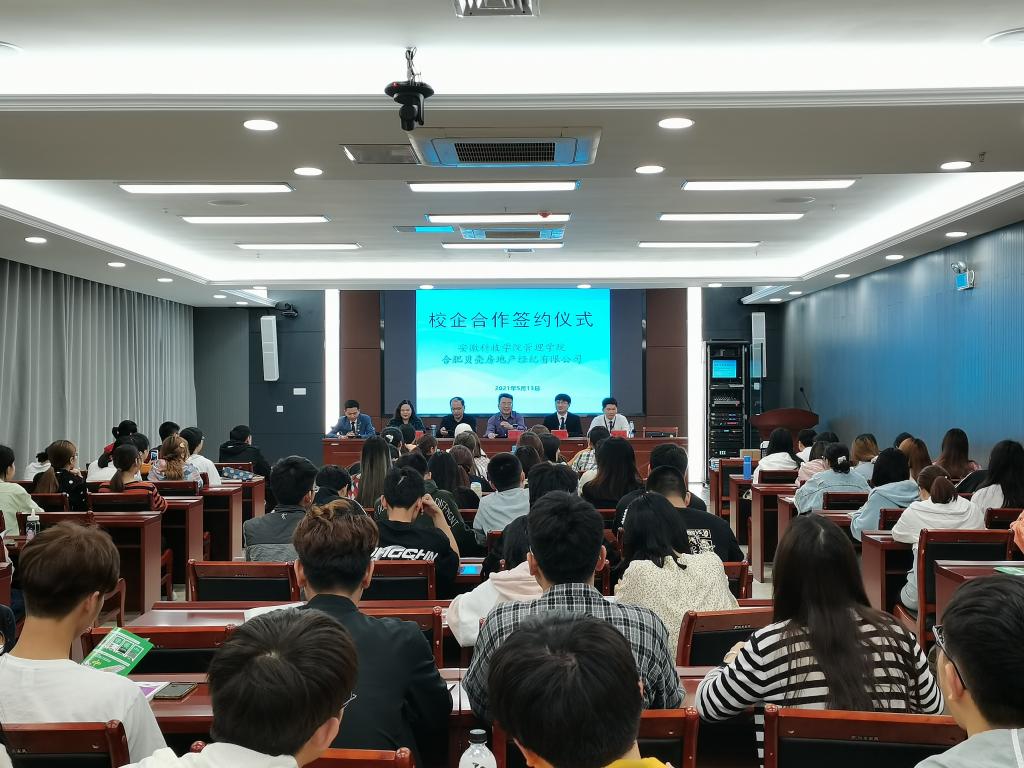 5月13日下午,管理学院与合肥贝壳房地产经纪有限公司校企合作签约暨授牌仪式在西附楼111会议室隆重举行。管理学院党委书记丁景良、院长赵伟峰、副院长郑谦,合肥贝壳房地产经纪有限公司(以下简称合肥贝壳)人力总监王浩,物流管理17届毕业生、合肥贝壳合肥校招城市负责人柏光磊,市场营销(专升本)15届毕业生、合肥贝壳合肥市城中区商圈经理王银兵、2018级市场营销、工商管理全体同学出席了签约授牌仪式。仪式由丁景良主持。