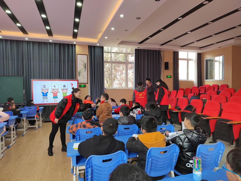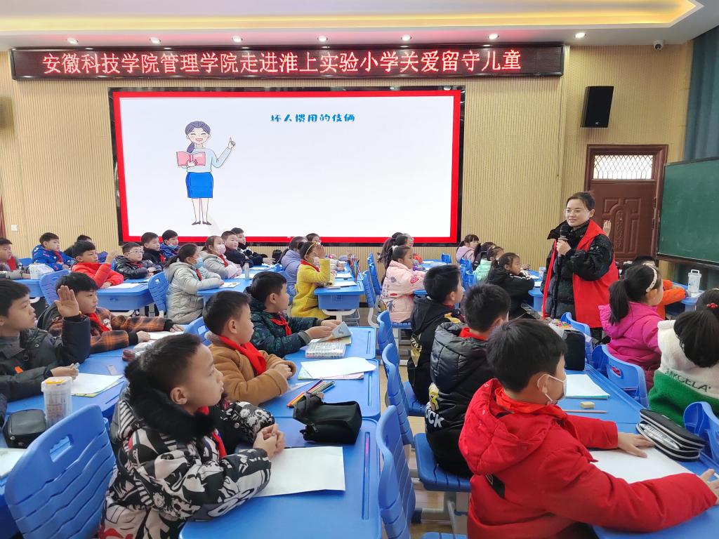 为积极践行志愿服务精神,展现安科研究生良好精神风貌,同时更好关注留守儿童的健康成长,丰富留守儿童的校园文化生活,应蚌埠市淮上实验小学邀请,管理学院根据其需求有针对性地制定了关爱留守儿童“蓝信封”活动实施方案。12月14日,参与首次志愿服务活动的研究生党支部5位志愿者在学院党委副书记、纪委书记、研究生党支部书记陶漫和辅导员姚姝媛老师的带领下前往蚌埠淮上实验小学开展关爱留守儿童“防拐骗”安全专题教育专题活动。活动由农业管理领域2021级研究生刘雅南主讲。