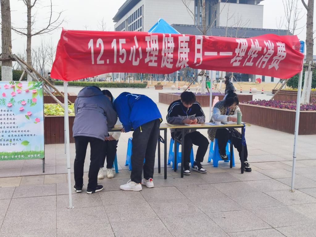 为了响应第一届“12.15”大学生心理健康月活动和学院心理育人工作安排,结合近期学生遇到的问题,管理学院于12月15日下午在众创空间东侧小广场开展了一场主题为“如何保持理性消费心理”的主题宣传活动。