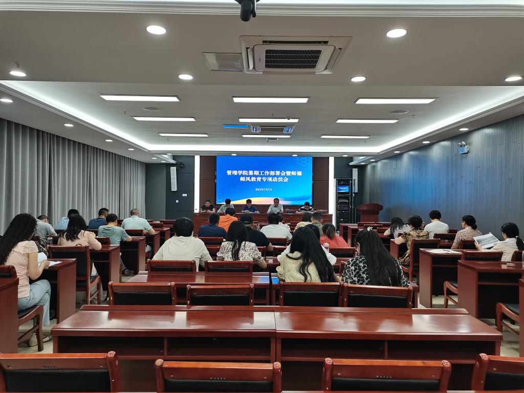 为切实推进暑期各项重点工作有效落实,强化学院教师队伍师德师风建设,7月7日上午,管理学院在西附楼111会议室召开暑期工作部署会暨师德师风教育专项动员会。学院党政领导及全体教职工参加会议,会议由学院党委书记丁景良主持。