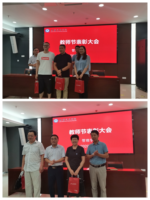 工会主席雷宇宣读《关于表彰管理学院“第一届最受学生欢迎教师”和“从教30年特别贡献奖”的决定》。市场营销系教师张红军、物流管理系教师奚雷、工商管理系教师郑谦获得“管理学院第一届最受学生欢迎教师”荣誉称号;市场营销系胡月英老师、工商管理系盛先友老师获得“从教30年特别贡献奖”。学院领导为获奖老师颁发奖品并拍照留影。