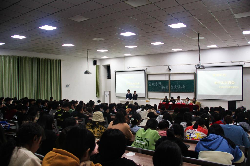 为帮助2020级新生尽快适应大学生活,明确自己的方向,10月30日晚,管理学院在致知楼A111教室举行了新老生交流会。本次交流会邀请了院学生会执行主席许恒凯、社团管理部主席朱小丽、分团委组织部部长周迪、心理健康中心主任陈玉华和宣传部副部长牛大洋参加交流。