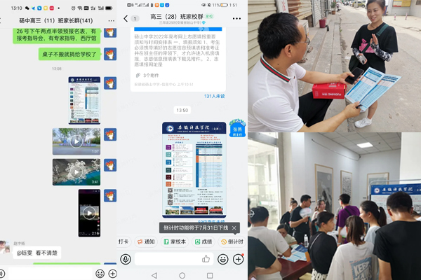 本次活动由我组成员负责,本次活动分为四个部分:一,联系本届高考生或者毕业班老师分享QY球友会招生宣传资料电子档;二、我组成员各自联系以前的班主任,看望班主任并向班主任汇报自入大学以来的生活和成长;三、在砀山中学校园内进行现场宣传,包括海报的张贴、宣传折页的发放、为考生解疑答惑播放我校招生视频等;四、同我校负责来砀山中学招生的老师一道,在高招会上为前来的学生及家长解疑答惑,分享我们在安科学习和生活的日常。