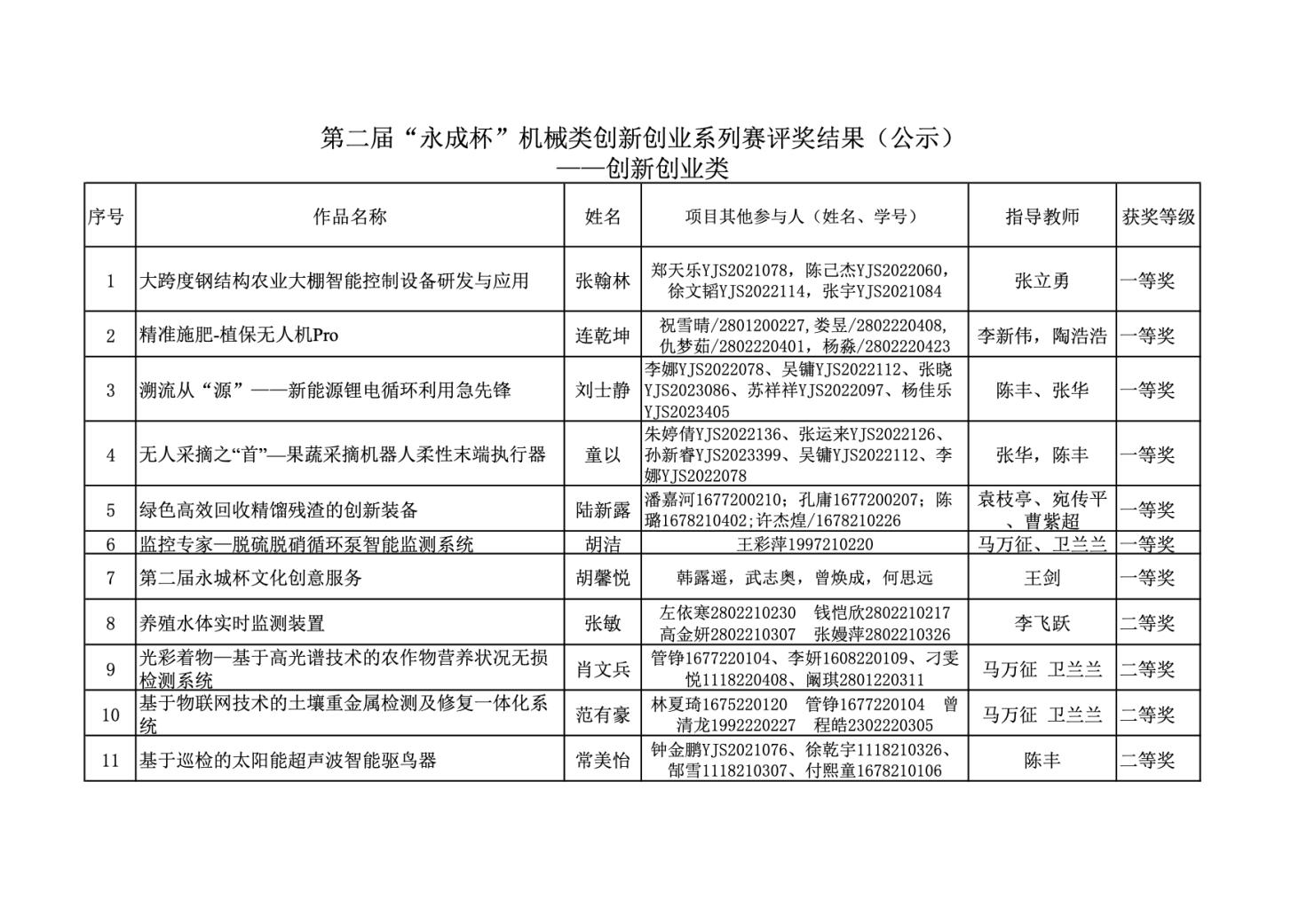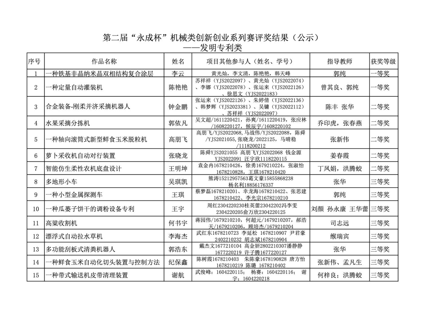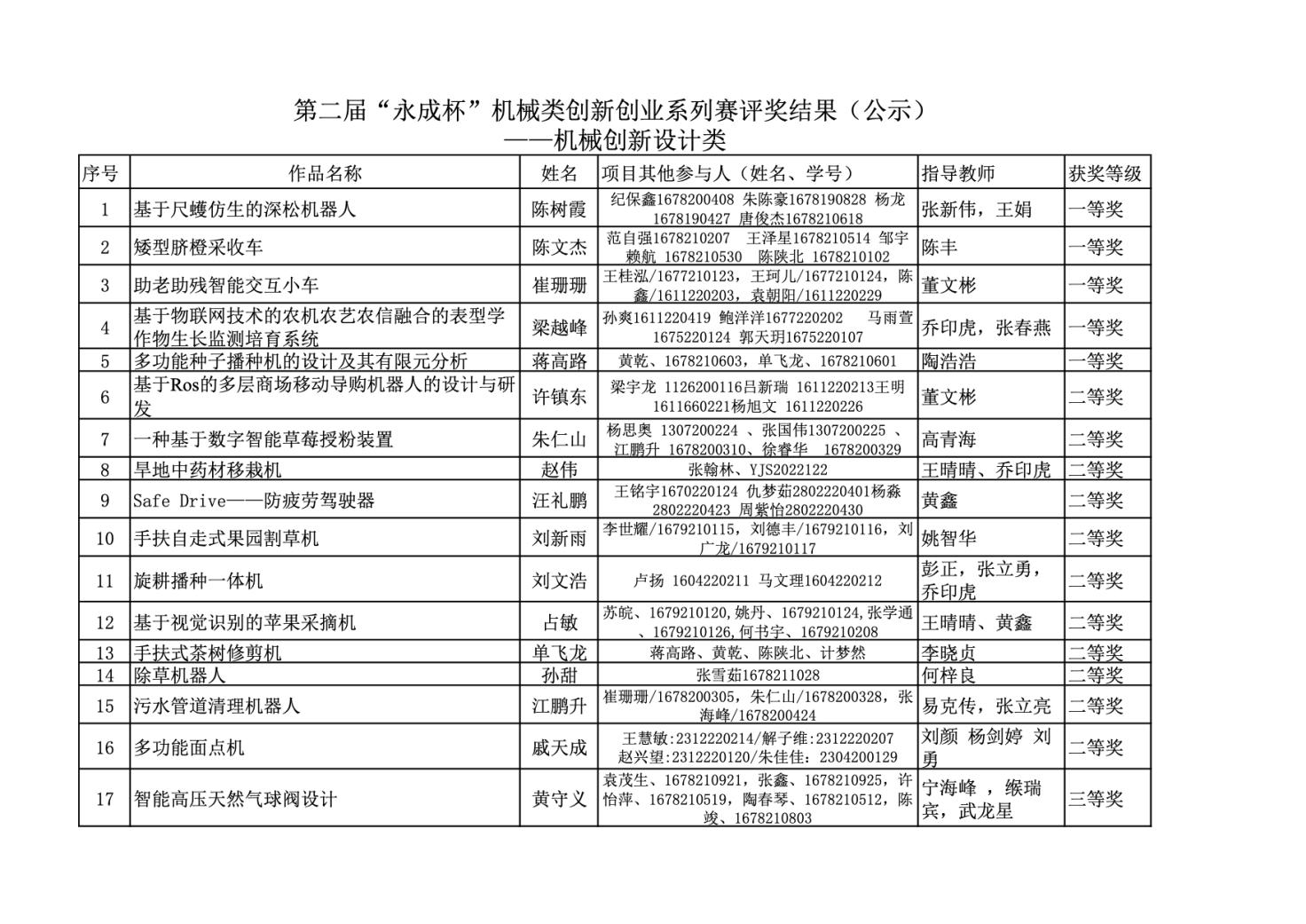 现将获奖名单予以公示,公示时间为2023 年11月13日至2023年11月20日。公示期间,如有异议,请向教务处或机械工程学院反映。
