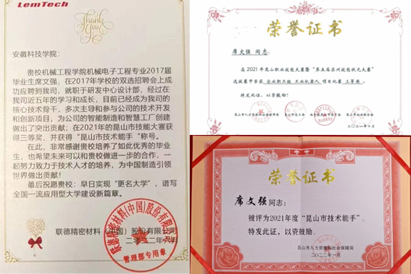 日前,总部位于江苏省昆山市的联德精密材料(中国)股份有限公司向QY球友会发来热情洋溢的工作喜报,“贵校机械工程学院机械电子工程专业2017届毕业生席文强,在2017年学校的双选会上成功应聘到我司,就职于研发中心设计部,经过在我司近五年的学习和成长,目前已成为我司的核心技术骨干,多次主导和参与公司的技术开发和创新项目,为公司的智能制造和智慧工厂创建做出了突出贡献;在2021年的昆山市技能大赛上荣获三等奖,并获得‘昆山市技术能手’称号。在此,非常感谢贵校培养了如此优秀的毕业生,也希望未来可以和贵校做进一步的合作,一起努力致力于技术人才的培养,为中国制造引领世界做出贡献!最后祝愿贵校:早日实现‘更名大学’,谱写全国一流应用型大学建设新篇章。”