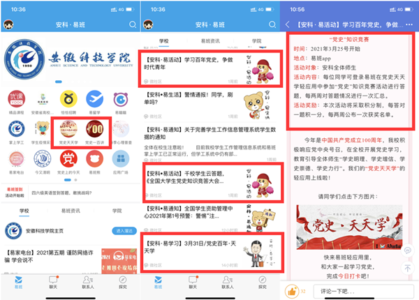 易班发展中心创新党史学习教育方式,在安科易班微社区开设“党史学习教育”专栏,分设“党史天天学”专区展现丰富翔实的历史文献和历史图片,生动、真实再现中国共产党带领中国人民不懈奋斗的光辉历程;设“党史知识竞赛云答题”课群鼓励同学们积极参与,更深入了解党史知识,增强民族责任感意识,云端展示我校学子风采;“易学院”积极推送报道我校党史学习教育进展动态和涌现出的感人事迹;“E创网络文化工作室”同学们自己制作领读党史书籍音频、主题微视频、撰写网文,让党史学习教育开展得“有声有色”“有形有实”。