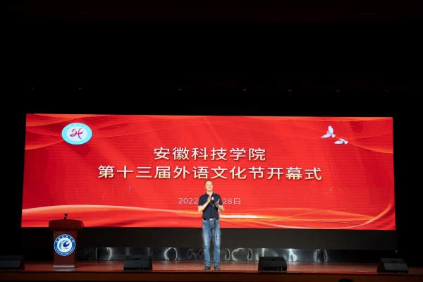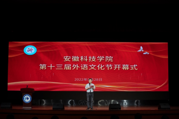 外国语学院党委副书记张海亮宣读QY球友会第十三届外语文化节实施方案,工作人员宣读建筑学院等单位为外语文化节开幕发来的贺信。