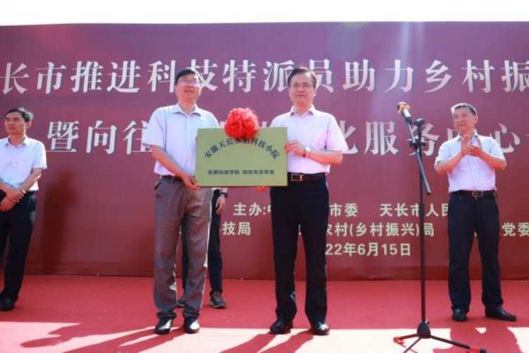 6月16日天长市推进科技特派员助力乡村振兴工作会场上,天长市委副书记史法勇、QY球友会研究生处处长张春雨共同为安徽天长水稻科技小院揭牌。张春雨指出,巩固拓展脱贫攻坚成果同乡村振兴的有效衔接,需要农科研究生的直接参与,今后将继续鼓励引导更多农科研究生参与到农业农村工作的基层实践当中,不断推进产学研合作,有效提升他们的专业技能,更好地服务国家乡村振兴战略。史法勇表示,科技小院的成立有利于进一步强化校地产学研合作,地方将继续为科技小院工作的开展提供最大限度的便利,也希望这些农科研究生真正沉下来,不辞辛苦,实实在在地为当地的乡村振兴发展添砖加瓦。