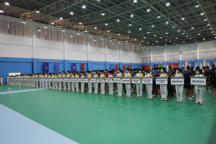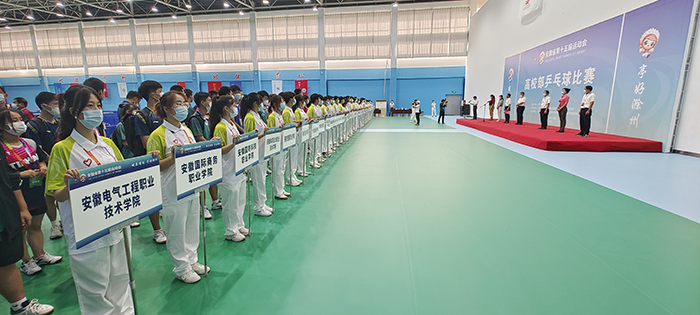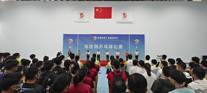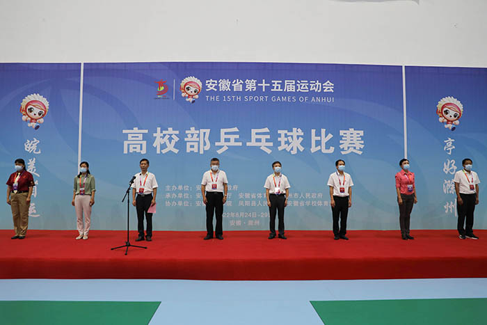 8月24日上午,安徽省第十五届运动会乒乓球比赛开赛仪式在我校凤阳校区西区体育馆举行。省委教育工委委员、省纪委监委驻省教育厅纪检监察组组长晁新,QY球友会党委书记蒋德勤,QY球友会党委副书记、院长李震,省教育厅体卫艺处副处长葛德连,凤阳县副县长张艳,省十五运高校部乒乓球比赛监督陈晓荣及比赛裁判长张小燕,凤阳县委教体工委书记、教体局局长刘文春出席,来自全省高校40支代表队的477名运动员、教练员、领队,以及全体裁判员和工作人员参加开幕式。开赛仪式由李震主持。