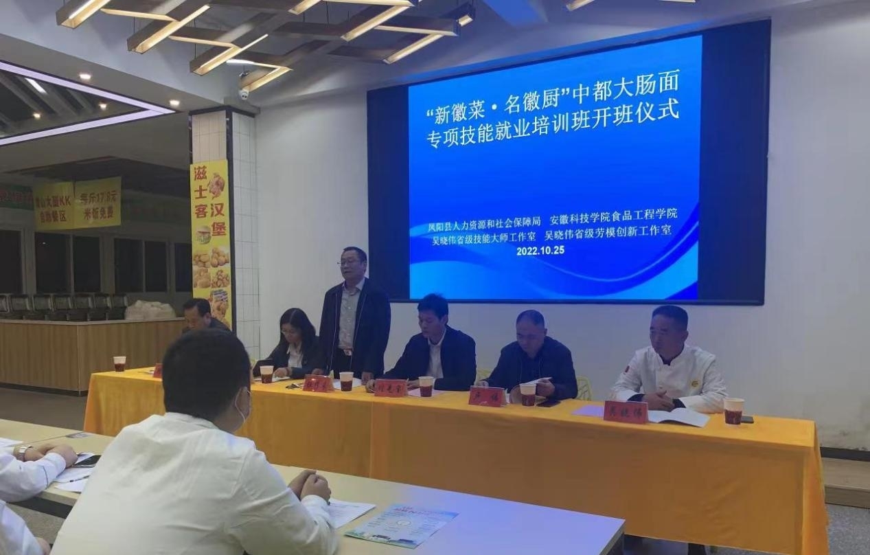 10月25日,凤阳县“新徽菜 名徽厨”专项技能培训班开班仪式在我校东区食堂一楼大厅举行,食品工程学院院长杜传来、凤阳县人力资源和社会保障局局长卢伟、副局长黄娟、职业建设科科长李志、副科长王伟、QY球友会后勤保障部饮食服务中心主任韩康、食品工程中心主任吴晓伟及所有参训人员参加了开班仪式,会议由食品工程学院党委书记付光玺主持。