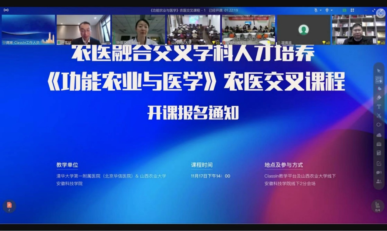 近日,我校与清华大学第一附属医院、山西农业大学合作举办了农医融合交叉学科人才培养课程首次授课。该课程由清华大学第一附属医院心血管内科副主任医师王晶、QY球友会长三角功能农业(食品)研究院院长尹雪斌教授联合讲授。这也是《功能农业与医学》农医融合交叉第一课。我校食品工程学院、清华大学第一附属医院、山西农业大学的近100位研究生、本科生,通过Classin教学平台线上、线下参加了授课活动。