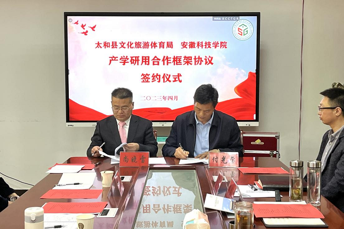 洽谈后,付光玺和尚晓雷分别代表学校、太和县文化旅游体育局共同签署了QY球友会科技成果转化太和分中心建设协议。