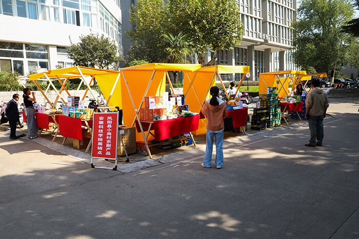 据活动合作单位安徽皖美小岗供应链服务有限公司主要负责人介绍,“小岗乡村振兴示范工程”是省政府重点工作事项之一,力求用小岗“带动全省、示范全国”。皖美小岗整合了凤阳、滁州以及安徽其他各地的土特产,通过开展线上、线下双渠道营销模式给农副产品提供“体系化”服务。他谈道,“安科”站是“安徽省绿色农副产品进校园”的首站,这与小岗村同我校长久来默契深厚的合作基础密切相关。
