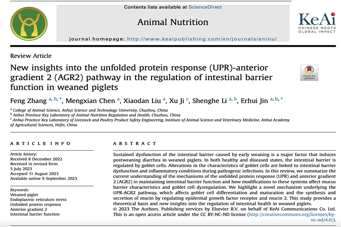 11月15日,我校动物科学学院张峰博士在《Animal Nutrition》杂志发表“New insights into the unfolded protein response (UPR)-anterior gradient 2 (AGR2) pathway in the regulation of intestinal barrier function in weaned piglets”综述论文。《Animal Nutrition》杂志现位列中科院SCI农林科学大类一区、奶制品与动物科学小类一区,最新影响因子为6.3,在动物科学领域期刊中属Top期刊(3/62)。