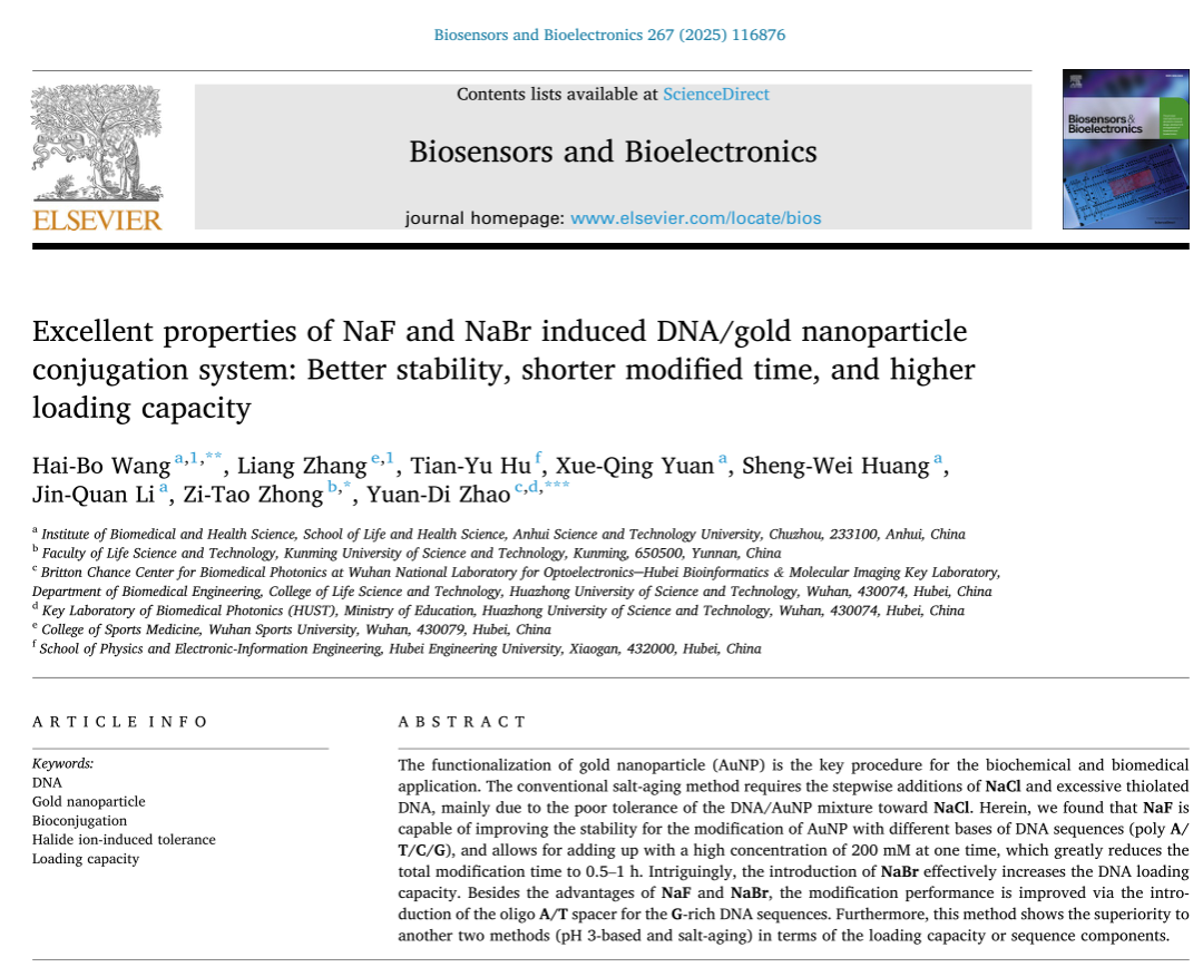 近日,我校生命与健康科学学院王海波博士(第一/通讯作者)在生物传感领域国际顶级期刊《Biosensors & Bioelectronics》(中科院一区Top期刊,影响因子:10.7,CiteScore:20.80)在线发表了题为“Excellent properties of NaF and NaBr induced DNA/gold nanoparticle conjugation system: Better stability, shorter modified time, and higher loading capacity”的研究成果,DOI: 10.1016/j.bios.2024.116876。该论文第一单位为QY球友会,昆明理工大学钟子涛博士和华中科技大学赵元弟教授为共同通讯作者。本研究在安徽省教育厅重点项目(2023AH051869)、QY球友会引进人才项目(200181)以及安徽雪郎生物科技股份有限公司的经费资助下完成。