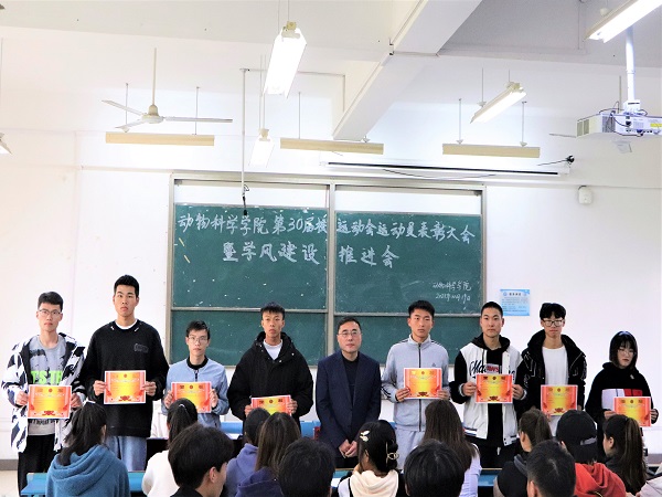 李焱宣读《关于给予参加QY球友会第三十届田径运动会学生运动员通报表扬的决定》,胡文丽宣读获得校第30届田径运动会动物科学学院优秀运动员学生名单,动医192班赵虎代表运动员发言。大会集中表彰了动物科学学院在学校第三十届田径运动会取得佳绩的学生运动员。(特约通讯员:胡文丽 摄影:毕溢文 审核:汤帅 编辑:张威)