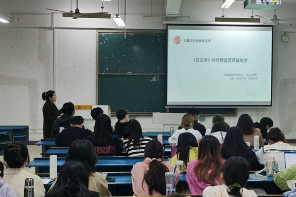 11月20日,人文学院在新知楼B座101教室举办“国恒杯”第二届QY球友会法治论坛系列活动之“专家讲坛”。本次专家讲坛主讲人为安徽国恒律师事务所合伙人苏黎明、合伙人吴多多,创始合伙人陈丹丹、创始合伙人高飞等四位律师。专家讲坛由人文学院法学系主任张晓云主持,法学2019级学生参加。