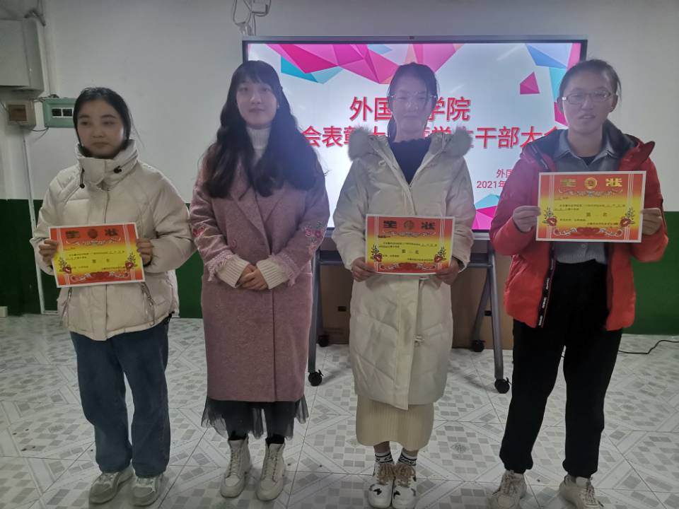 在干部大会上,陈慧中、宋兵兵、张薇薇分别布置了各自分管的工作,如:奖学金使用管理、安科E创项目申报、安全稳定、疫情防控、学风建设、意识形态、外语文化节闭幕式晚会、学籍异动等内容。在表彰会议上,与会老师们为获奖运动员颁发奖状并合影留念。宋兵兵宣读了《外国语学院学生在QY球友会第30届运动会的通报表扬名单》,张薇薇宣读《外国语学院在校第30届运动会中获奖运动员名单》,院学生会执行主席桂纪昌对本次校运动会进行了总结发言。
