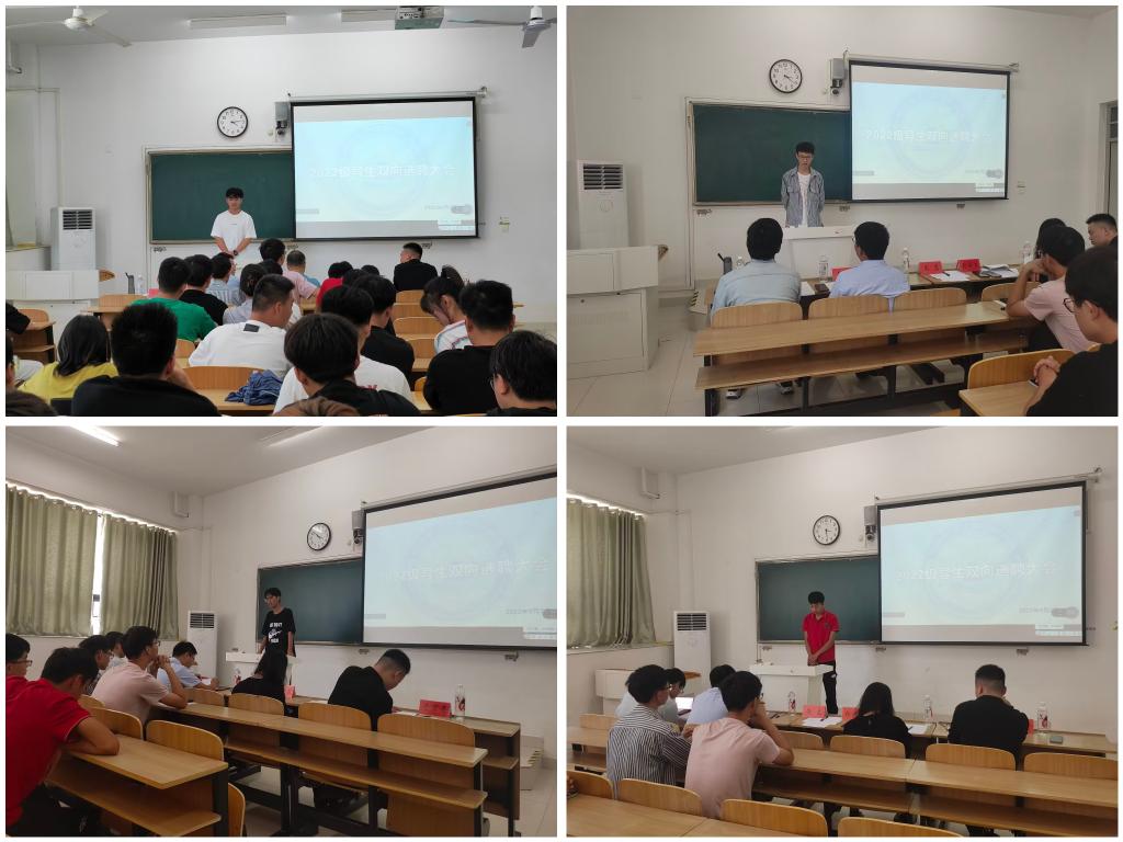 面试开始,上届导生团团长韦新宇汇报导生选聘上一阶段工作完成情况,接着候选导生依次上台从自我介绍、工作能力及日后的工作规划等方面进行时长3分钟的自我陈述。面试官根据面试者的发言,从应聘学生所学专业、实践经验、个人能力方面考察面试学生的临场应变能力,并根据学生面试表现,采取百分制综合给定面试分数。