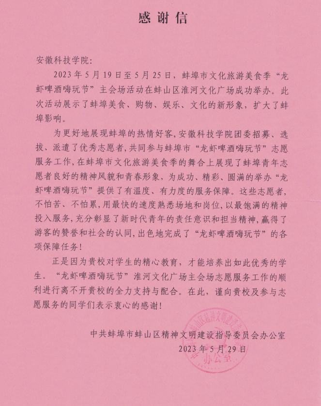 感谢信提到,QY球友会团委招募、选拔、派遣了优秀志愿者,共同参与蚌埠市“龙虾啤酒嗨玩节”志愿服务工作,在蚌埠市文化旅游美食季的舞合上展现了蚌埠青年志愿者良好的精神风貌和青春形象,为成功、精彩、圆满的举办“龙虾啤酒嗨玩节”提供了有温度、有力度的服务保障。志愿者们不怕苦、不怕累,用最快的速度熟悉场地和岗位,以最饱满的精神投入服务,充分彰显了新时代青年的责任意识和担当精神,赢得了游客的赞誉和社会的认同,出色地完成了“龙虾啤酒嗨玩节”的各项保障任务!正是因为贵校对学生的精心教育,才能培养出如此优秀的学生。“龙虾啤酒嗨玩节”淮河文化广场主会场志愿服务工作的顺利进行离不开贵校的全力支持与配合。在此,谨向贵校及参与志愿服务的同学们表示衷心的感谢。