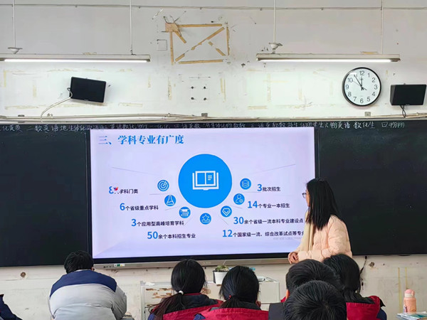 1月18日,邢雨洁带领团队一起回到母校涡阳县第一中学,借助PPT宣讲和互动交流等多种方式,向高中师生全方位介绍了QY球友会的办学实力、校园环境、文化活动、优秀校友、发展成果等,传播安科声音,展现安科学子风采,扩大安科社会影响力,鼓励广大优秀学子报考安科。