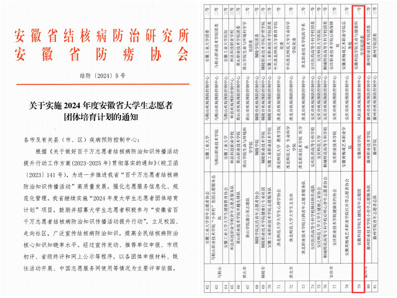 生命与健康科学学院团委自2020年获批安徽省大学生志愿者团体培育计划资助以来,一直秉承“奉献、友爱、互助、进取”的志愿者精神,在校内外积极开展各类志愿服务活动。今年的3月24日是第29个“世界防治结核病日”。生命与健康科学学院青年志愿团已连续7年开展“世界防治结核病日”主题宣传活动。2024年度“安徽省大学生志愿者团体培育计划”评选结果出炉,该团体获得一等资助。同时,该团体分别荣获2023年度安徽省和全国百千万志愿者结核病防治知识传播活动优秀志愿者团体称号,据悉获得全国百千万志愿者结核病防治知识传播活动优秀志愿者团体称号的安徽省有12个。未来,生命与健康科学学院青年志愿团将继续为打造健康校园,共创美好未来而努力奋斗。(特约通讯员:王传林 摄影:朱琦 谢佳梦 陈子涵 卢莲莲 杨青柳 审核:彭丽萍 编辑:李锦)