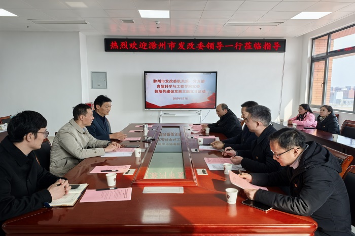 3月7日下午,食品科学与工程学院与滁州市发展和改革委员会机关第一党支部联合开展以“校地共建促发展”为主题的党日活动。我校新校区党工委副书记、管委会常务副主任施培智,滁州市发改委党组成员、副主任范德胜出席活动。活动由食品科学与工程学院党委书记付光玺主持。