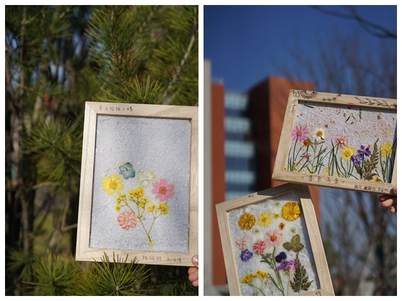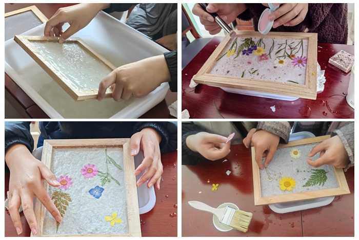 在实践环节,同学们分组体验“煮楻足火”“荡料入帘”等古法造纸技艺的核心工序。当看到经过浸泡蒸煮的构树皮在石臼中逐渐变成絮状纸浆,汉语言文学专业马亚楠同学感叹:“原以为纸张生产很简单,没想到要经过这么多复杂步骤。”在抄纸帘上均匀铺浆、晾晒揭纸的过程中,大家深切体会到“一张纸来之不易”。更有同学发挥创意,在纸浆中加入花瓣、树叶,制作出具有个性化花纹的艺术纸张。