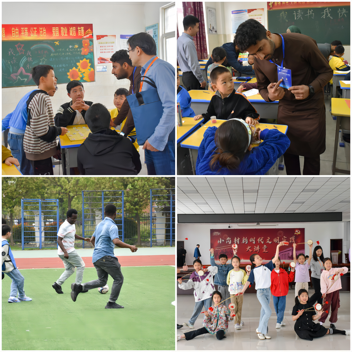 走出展馆,众人驱车来到了小岗学校,在小岗办负责人带领下,深入我校在小岗学校的6个素质拓展班课堂,与小朋友们和我校大学生教员亲切互动,氛围十分热烈。在绿茵场上,多位国际学生与“绿茵少年班”的小学员们展开了“点球大战”,通过激烈的交锋,拉近了彼此之间的距离;在“凤阳花鼓班”国际学生被大学生教员严格严谨的教学风格所吸引,并多次止不住地为小学员们精彩的舞蹈表演而鼓掌。走出课堂,来到该校“校训石”前,分管校长为众人介绍了关于小岗学校的办学历史、发展现状及教学特色,并希望安科师生,特别是国际学生能多来小岗学校考察交流。