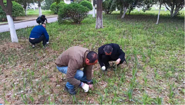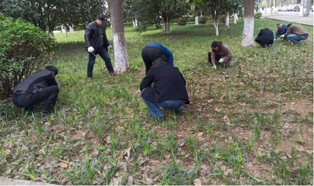 后勤保障部副主任柳卫国、谷凯带领后勤保障部党支部全体党员深入中办公楼西南角校园草坪和绿化带,带领大家亲手拔出杂草,捡拾草坪中的石块等废弃物,为绿化美化校园环境出一份力,获得了路过师生的一致点赞和好评。