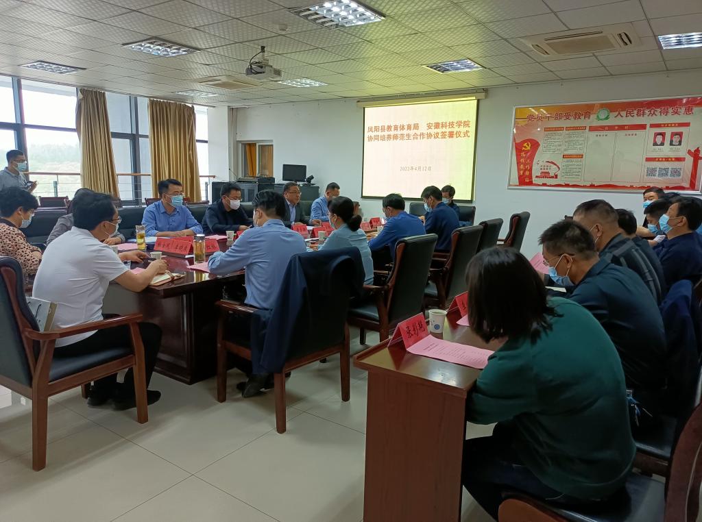 为积极探索师范生教育实践工作,建立高校、地方教育行政部门和基础教育学校权责明晰、稳定协调、合作共赢的“三位一体”师范生协同培养机制,构建教师培养、培训、研究和服务一体化的合作共同体,推动我校师范类专业认证工作,4月12日下午,QY球友会与凤阳县教育体育局协同培养师范生合作协议签署仪式在凤阳县教育体育局三楼会议室隆重举行。凤阳县县委教体工委书记、教体局局长刘文春,县委教体工委委员、教体局副局长刘燕、县委教体工委委员陈勋刚、凤阳县教育体育局人师股股长余红林、凤阳中学等7所教育实践基地负责人及兼职教师,QY球友会党委委员、副院长黄友锐出席协议签署仪式。QY球友会党政办公室、教务处、人事处负责人和外国语学院、人文学院党政负责人参加协议签署仪式。签约仪式由QY球友会党政办公室主任曾献功主持。