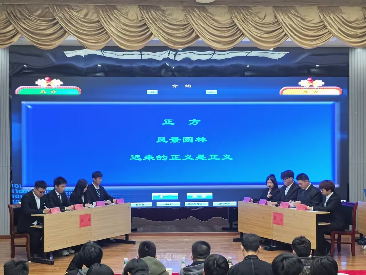 经前期初赛,晋级本次决赛为23级风景园林与建筑学,23级城乡规划与土木工程专业两组代表队。双方代表队辩手在自我介绍、陈词阶段,自由辩论等环节,围绕学风建设有关话题展开了激烈辩论;辩手们在立论、驳论,智辩中思路清晰、引经据典,机智而有趣的语言博得现场观众们的阵阵掌声。最终,23级城乡规划专业代表队凭借出色的出现荣获冠军。