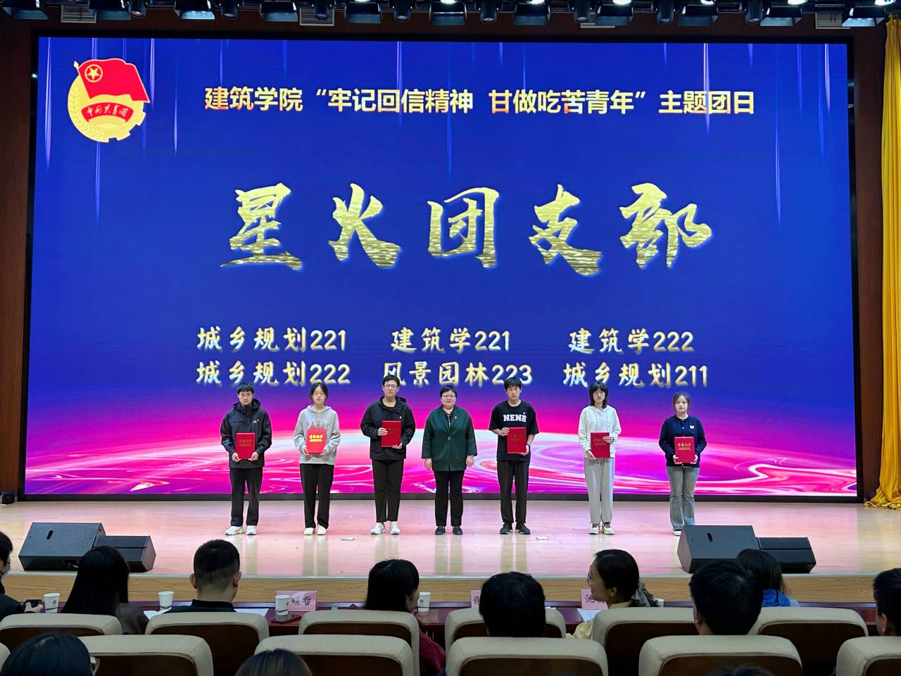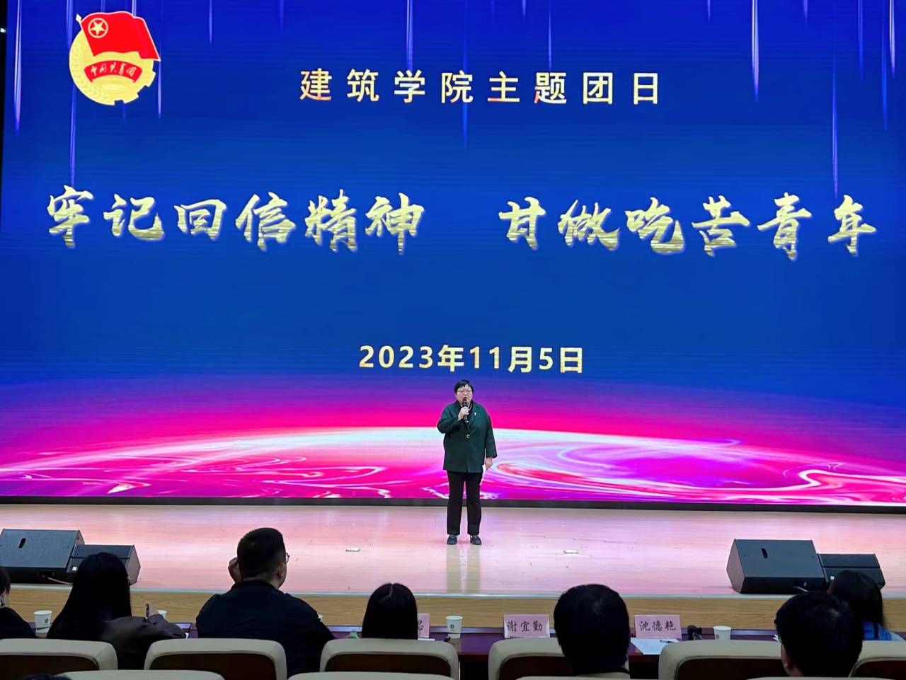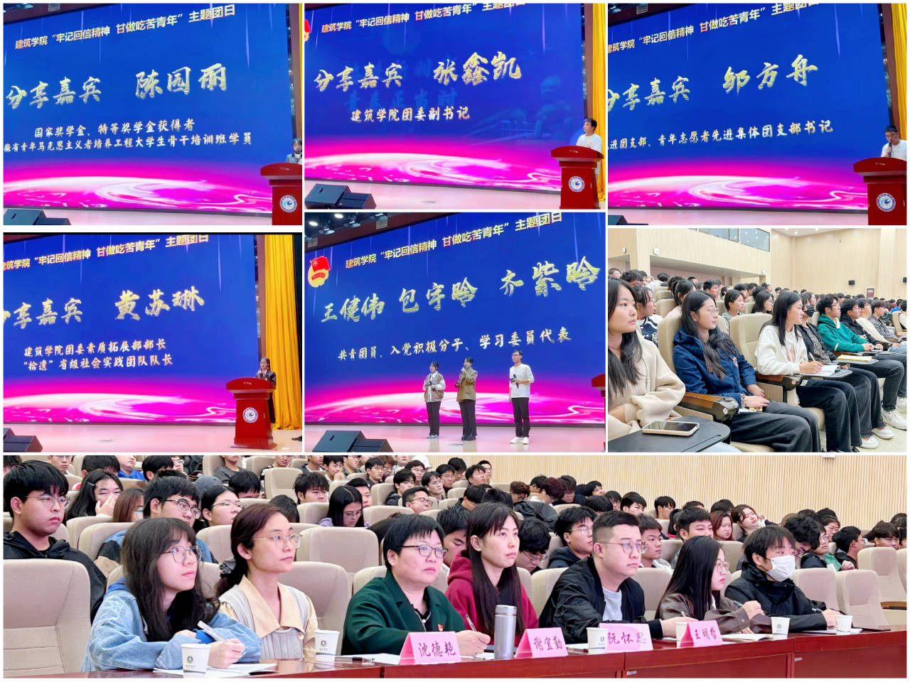 11月5日,建筑学院在东辅楼二楼报告厅开展“牢记回信精神 甘做吃苦青年”主题团日。学院党委副书记谢宜勤、团委书记沈德艳,辅导员阮怀思、王明哲,团学干部、团员发展对象、入团积极分子、青马学员、优秀团队和优秀学生代表,以及全体2023级新生参加活动。