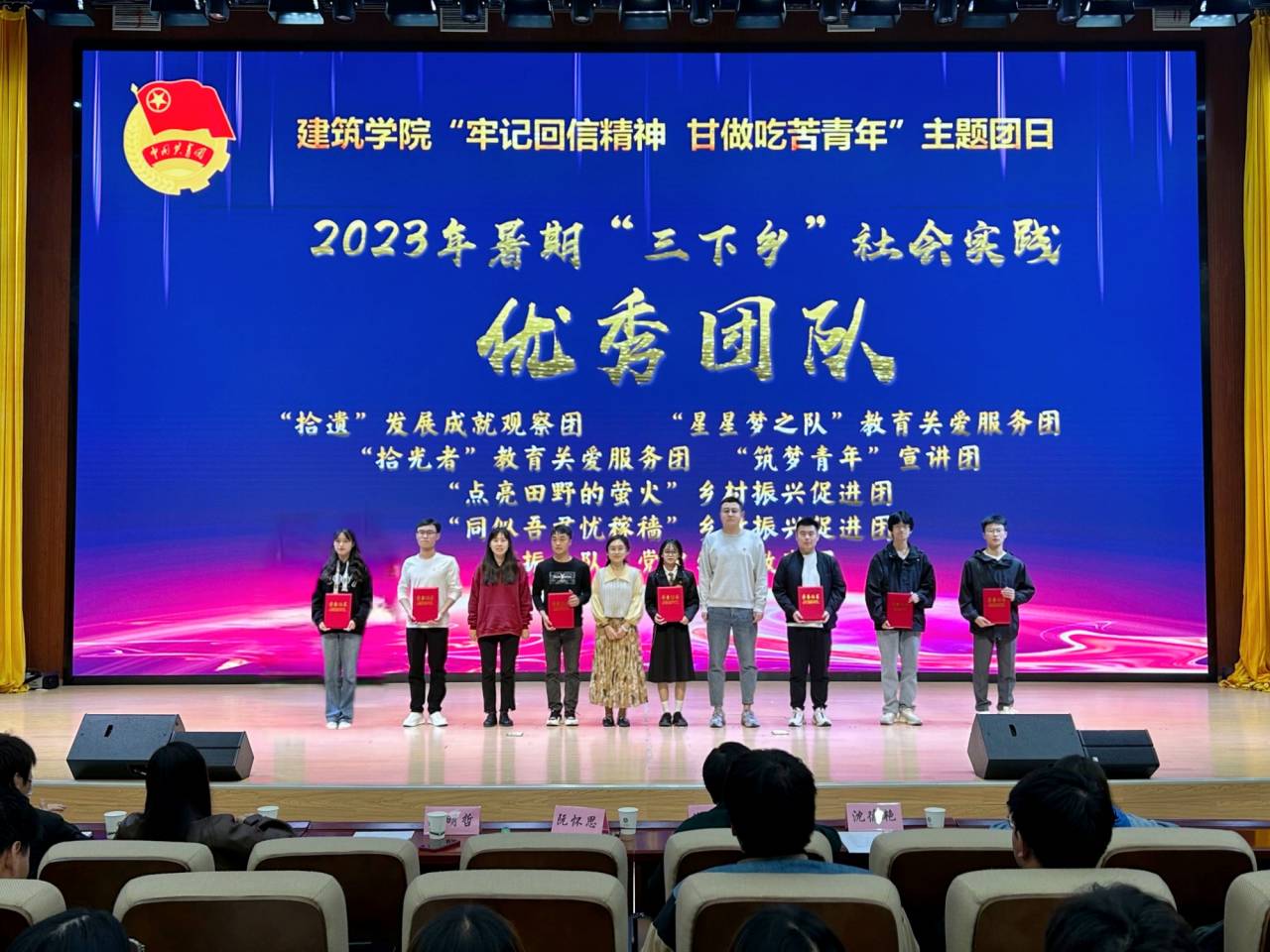 活动现场,老师们为学院2023年暑期“三下乡”社会实践优秀团队和星火团支部颁发了荣誉证书。