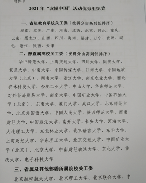 日前,在教育部关工委开展的 “读懂中国”活动中,QY球友会关工委获2021年“读懂中国”活动优秀组织奖,选送的征文《不忘入党初心,时刻为党争光》获优秀征文奖。